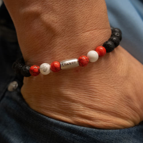 Deze stoere en trendy kralen armband voor heren, dames of kinderen is het perfecte cadeau voor die ene bijzondere Spartaan in jouw leven! De zwarte kralen van deze armband zorgen voor een stoere uitstraling. De armband is gemaakt van lavasteen(zwart) en kunststof kralen (rood/ wit).