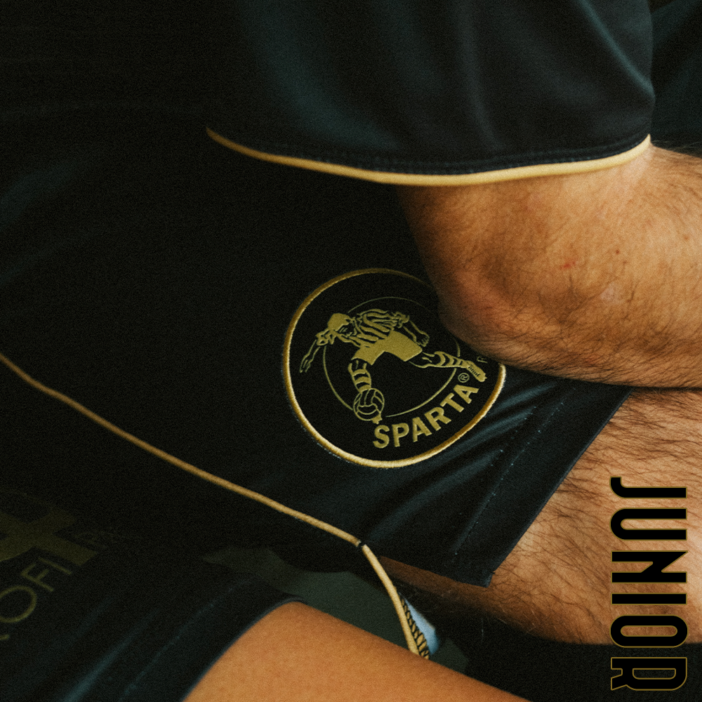 Het Ode aan Spangen-tenue is geheel zwart met gouden accenten en bevat de plattegrond van Spangen in gouden lijnenspel op de voorkant van het shirt. Daarnaast lees je op de achterkant van het shirt in de nek “ODE AAN SPANGEN” en is er plaats voor de postcode van de wijk aan de binnenkant van de kraag. Het tenue is vanaf nu online te koop in de Sparta Fanshop of kom langs in de Rood-Witte winkel.