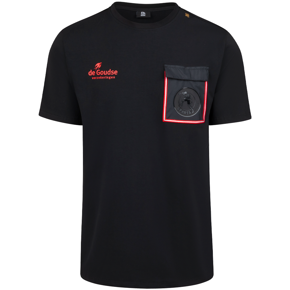 Nu verkrijgbaar in de Sparta Fanshop! Het Sparta presentatieshirt speler 24/25. Maak jouw Sparta-collectie compleet met dit comfortabele & sportieve shirt dat jij overal kan dragen. Draag hem op je gemak thuis of laat hem trots zien wanneer wedstrijden op Het Kasteel bekijkt. Het materiaal bevat 95% katoen en 5% elastaan, waardoor het extra comfortabel is en een optimale bewegingsvrijheid biedt. Het zwarte katoenen shirt met rode details biedt een fijne pasvorm met lichte stretch, heeft rode details, een zwart Sparta-logo en beschikt over een borstzakje.